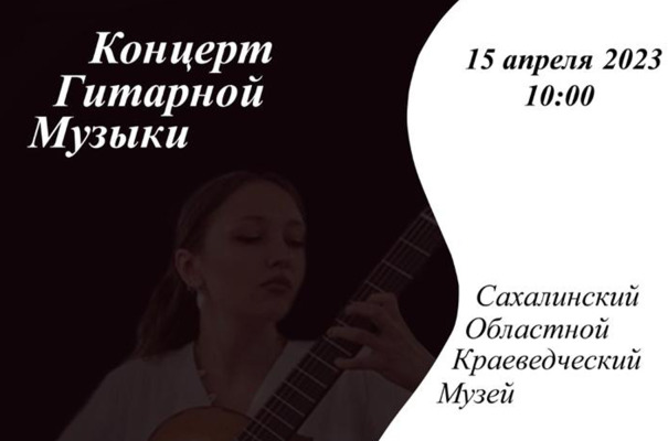 15 апреля с 10:00 в Сахалинском областном краеведческим музее зазвучит гитара. Для Вас соло и дуэт-номера исполнят лауреаты международных конкурсов Юлия Трофимчук и Игорь Бещетников. В программе: Бах, Скарлатти, Карулли, Таррега, Йокухиро, Тезар.