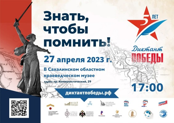 27 апреля 2023 года в 17:00 на площадке Сахалинского областного краеведческого музея пройдет пятый юбилейный «Диктант Победы». Это международная историческая акция на тему событий Великой Отечественной войны.