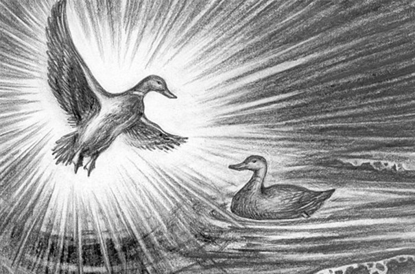 История повествует об утке, которая нигде не могла приземлиться – кругом вода. Тогда она выщипала из себя перья и пух и свила гнездо, куда отложила яйца. Из яиц вылупились птенцы, они выросли и последовали примеру мамы-утки. Их утята поступили так же. Получилось много гнезд, и сформировался остров, на котором выросли трава и деревья. С них опадали листья и хвоя – так была сотворена земля. С лиственницы стекла смола и, как только она коснулась земли, появился нивх. Орочон (уйльта) произошел от пихты, а айну – от ели.