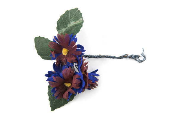 Изделия имеют вид небольших композиций размером 7х8 см, состоящих из двух и более цветков, соединенных вместе. Они были выполнены из искусственной кожи или ткани с включением элементов из ниток и металла.
