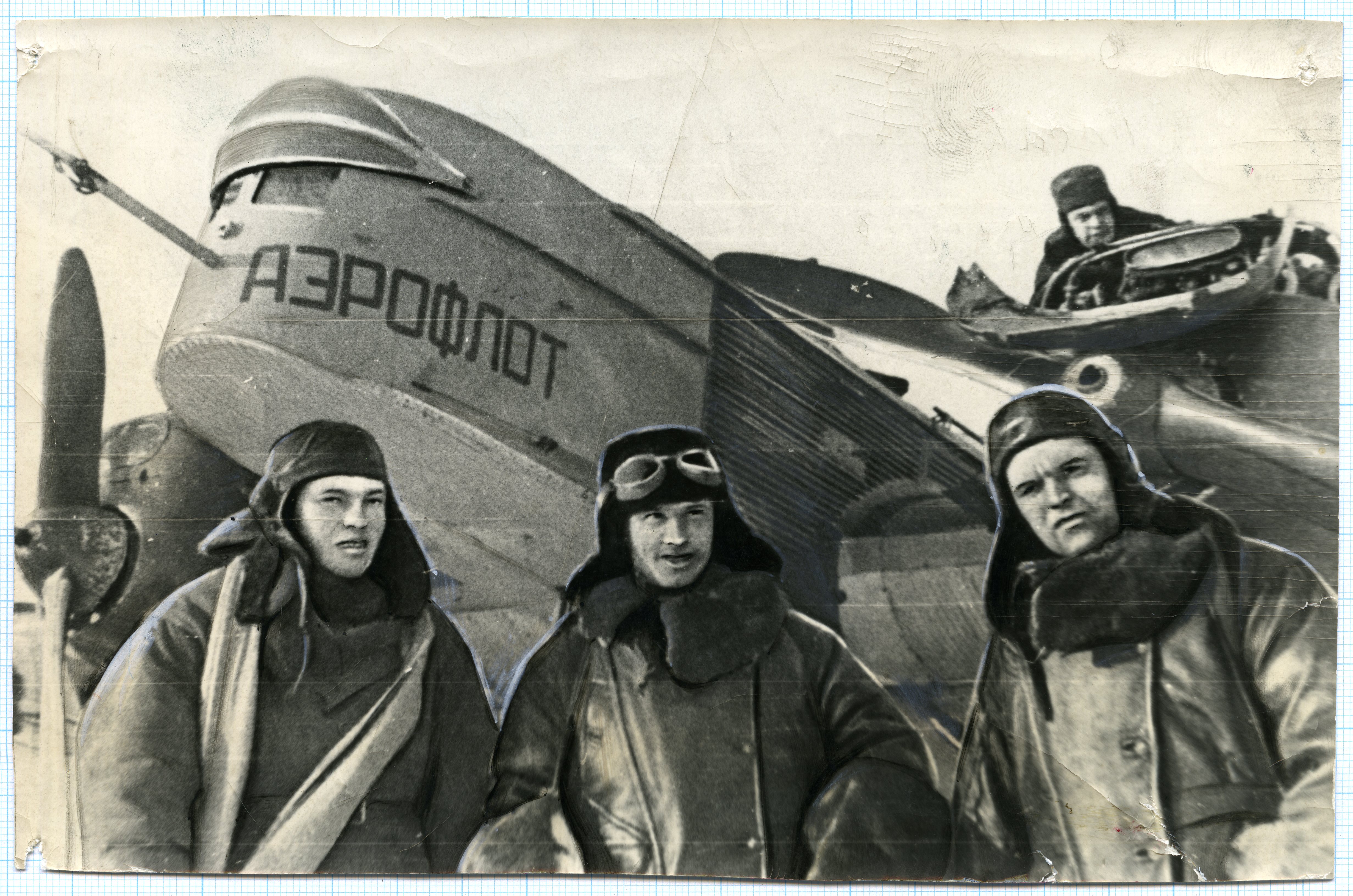Михаил Евгеньевич передал в Скопинский музей две фотографии, связанные со спасением «Родины». На одной запечатлен его экипаж, в который также входили радист Владимир Быстров и бортмеханик Константин Домкин. На другой – экипаж самолета «Родина», который удалось обнаружить именно благодаря сахалинскому летчику Сахарову.