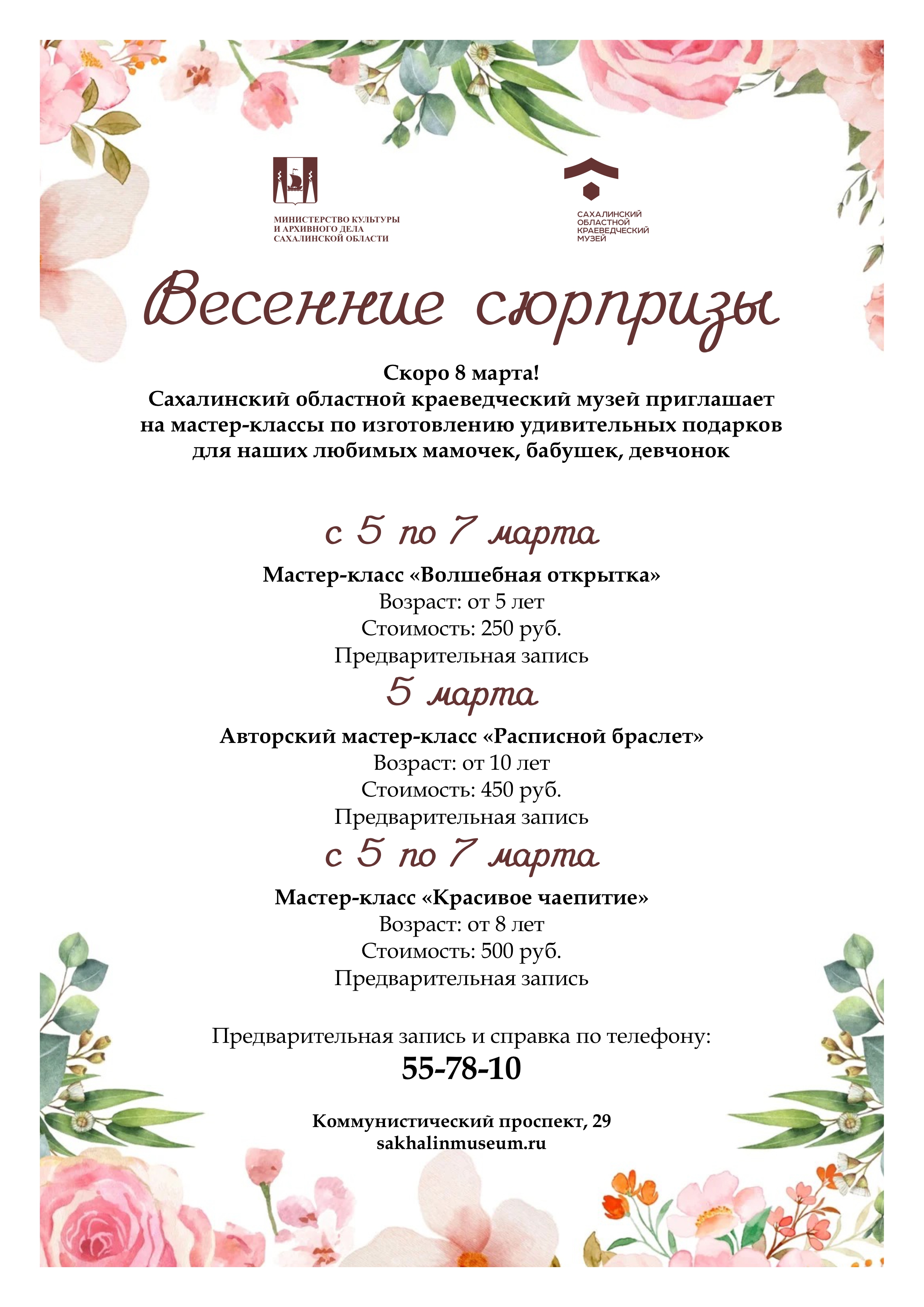 Друзья! Краеведческий музей приготовил для Вас весенние мастер-классы. Спешите порадовать себя и своих близких подарками ручной работы!