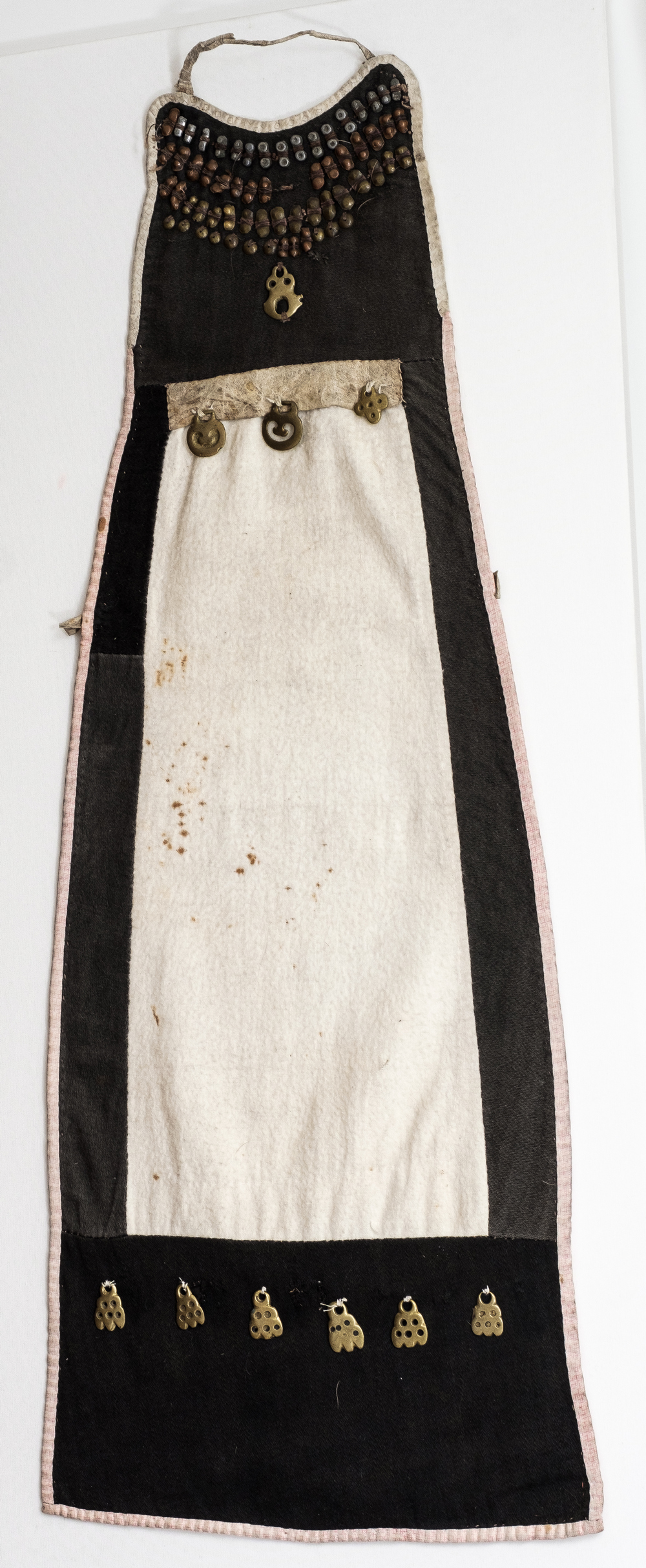 В этнографической коллекции Сахалинского областного краеведческого музея хранятся три нагрудника народов северной части о. Сахалин. Нагрудники были собраны в разное время. Первый поступил в музей в 1962 году от научного сотрудника музея Е.Д. Корзо, которая в этом же году выезжала в экспедиции для изучения материальной и духовной культуры народов в Ногликский и Поронайский районы. Нагрудник был сшит трапециевидной формы из ткани черного и белого цветов. По краю нагрудника выполнена окантовка тканью розового цвета, а его лицевая сторона украшена в верхней части и по подолу медными подвесками и вставками из кожи оленя. Этот нагрудник был выполнен в качестве элемента свадебного костюма уйльтинской невесты в первой половине ХХ века. Позднее его использовали как украшение к костюму в торжественных случаях, на праздниках. Как семейную реликвию нагрудник передала научному сотруднику музея Мария Степановна Михеева.