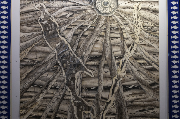 Панно выполнено в технике аппликации из кож разных видов рыбы – кета, кижуч, горбуша, сима, камбала и другие. Коренные народы традиционно использовали рыбью кожу для пошива одежды, обуви, сумок и не только. На картине изображены Сахалин и Курильские острова. Мы одними из первых встречаем рассвет и начинаем новый день, что отражено на полотне. В высоту и ширину картина достигает 180 сантиметров, а по форме она представляет собой пазл: собрав все его части воедино, мы увидим сцену из жизни коренных народов. Дополняют сюжет деревья, кит, рыбы, корабль, осьминог и краб.