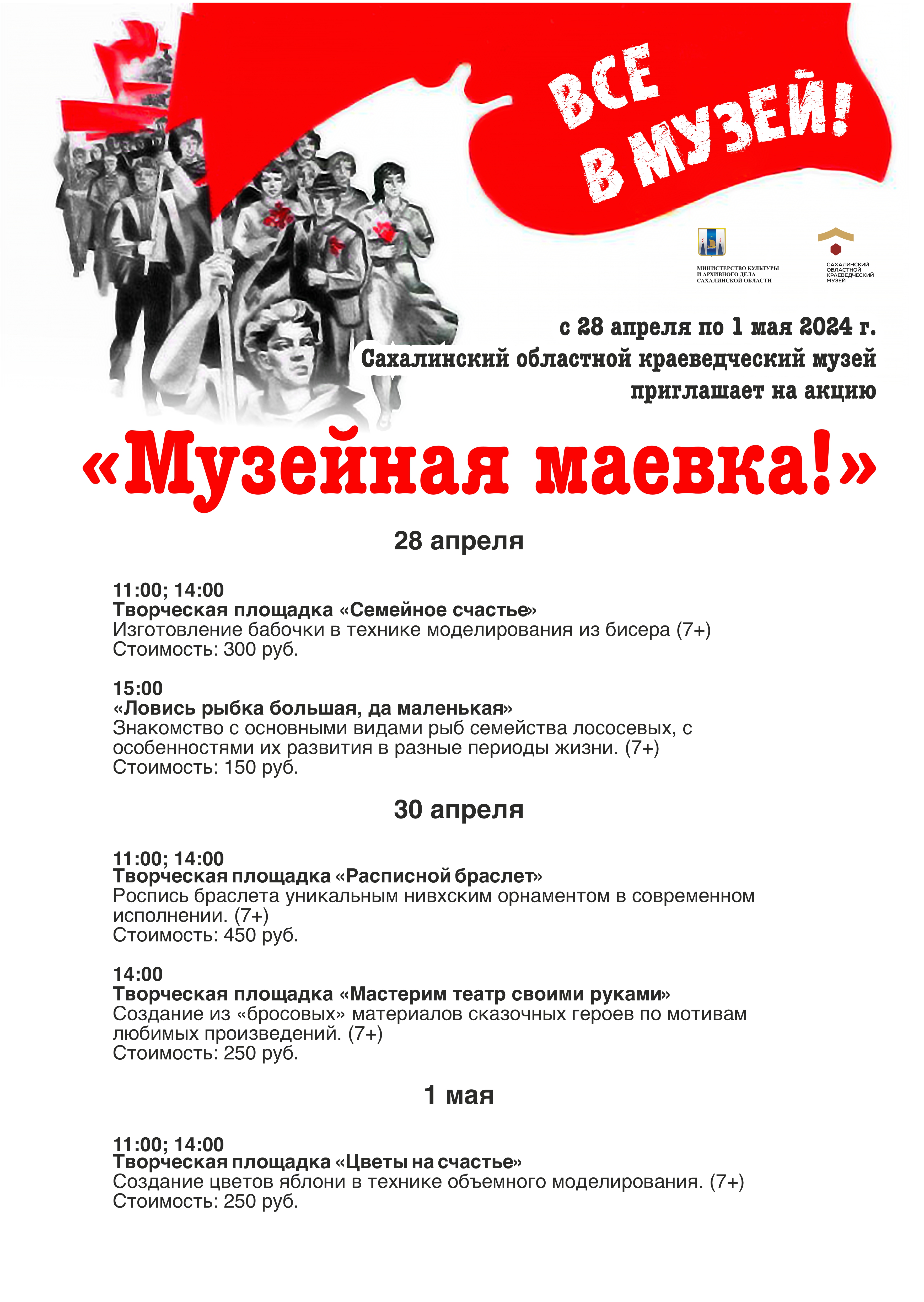 В честь праздника 1 мая – вход в музей бесплатный. Дополнительные услуги (участие в экскурсиях, мастер-классах и т.д.) – по прейскуранту.