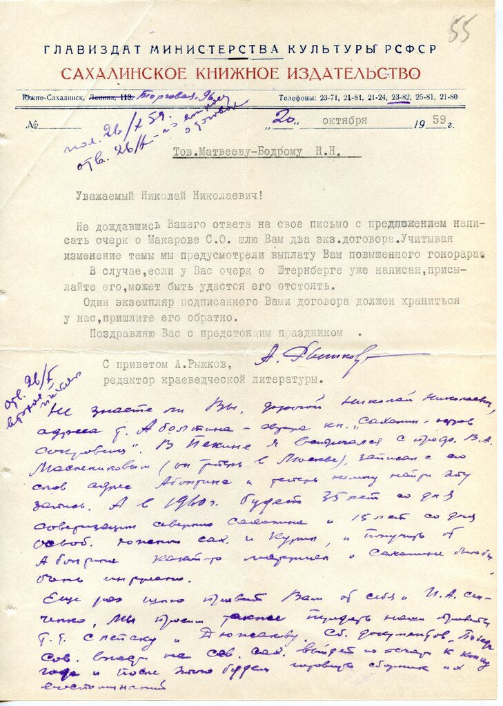 Первое письмо, датируемое 20 октября 1959 г., носит официальный характер и свидетельствует о наличии между Сахалинским книжным издательством и Н.Н. Матвеевым-Бодрым договорных отношений по поводу подготовки к изданию двух очерков.
