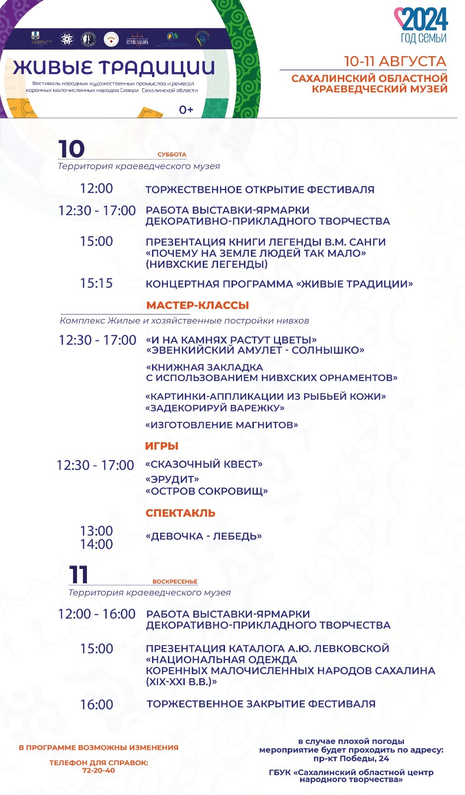 С 10 по 11 августа на территории Сахалинского областного краеведческого музея состоится VII Областной фестиваль народных художественных промыслов и ремесел коренных малочисленных народов Севера – «Живые традиции». Стоить отметить, что событие проходит в Год семьи и послужит укреплением семейных ценностей и традиций.