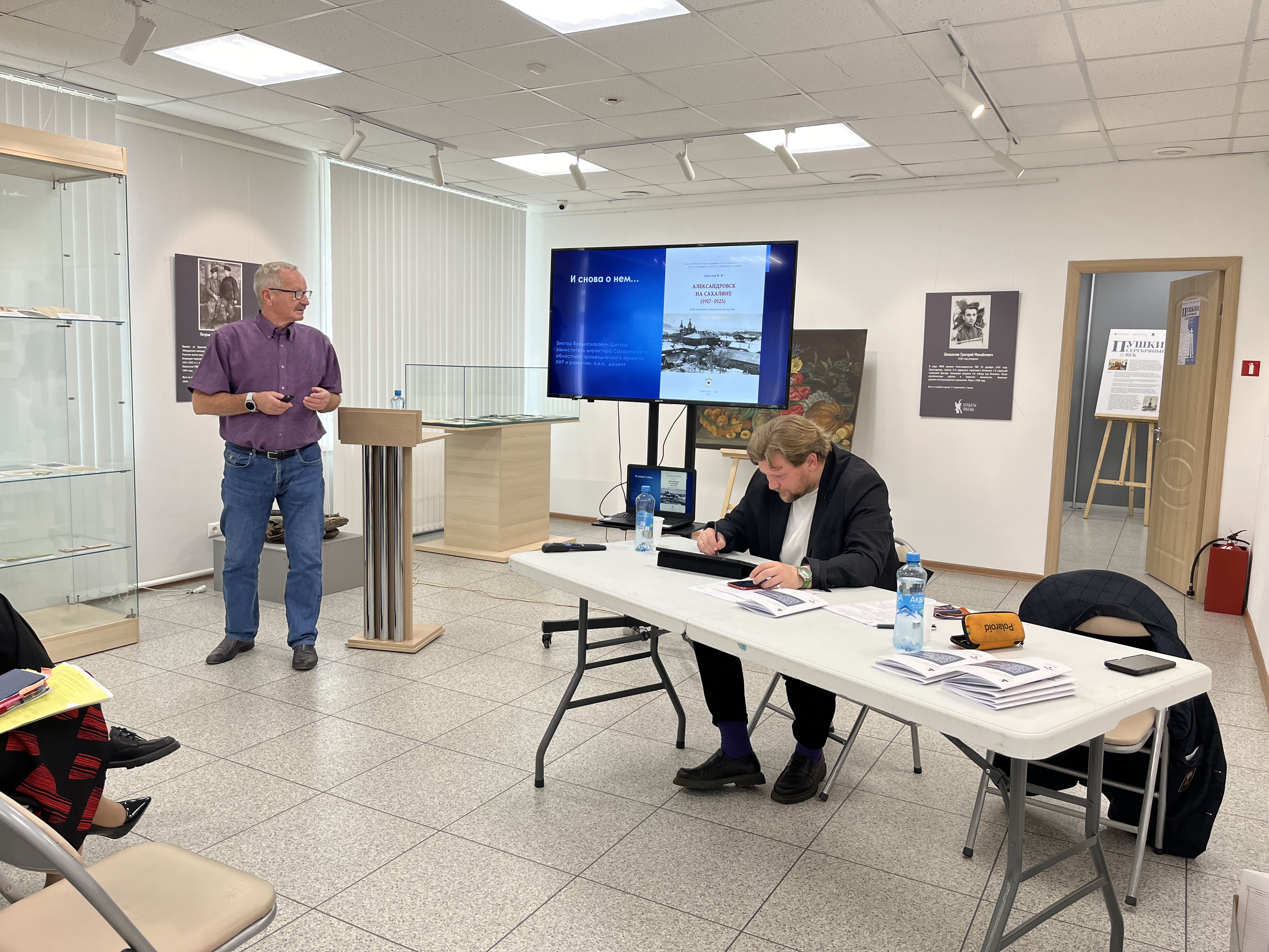 Завершил заседание методического семинара модератор, заместитель директора по научно-исследовательской работе и развитию ГБУК «Сахалинский областной краеведческий музей» В.В. Щеглов. Он рассказал о выходе книги «Александровск–на–Сахалине (1917-1925)». В своем выступлении Виктор Владиславович отметил несколько интересных и важных аспектов истории северной части Сахалина, имеющих значение для воспитания «локального» патриотизма. Презентация нового издания состоится в октябре 2024 г. в Сахалинском областном краеведческом музее.