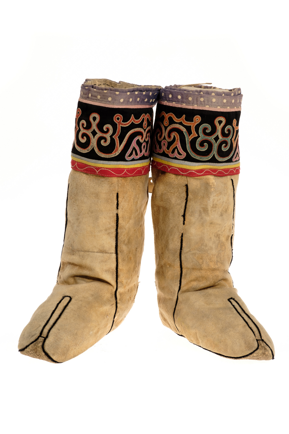 Декорировали обувь обычно вышивкой гладью с тамбуром в сочетании с бисером, эвенки использовали меховую мозаику в виде треугольников и квадратов, чередуя светлые и темные цвета.