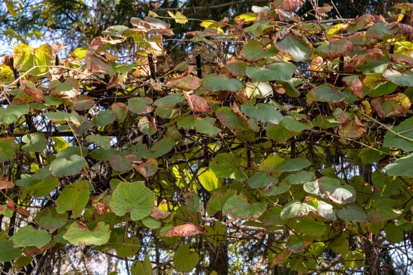 Лиана со стволом 5-10 см в диаметре и длиной 3-5 (редко до 15—18) м, в Японии встречаются изредка лозы длиной до 20 метров. Усики винограда способны совершать круговые движения, благодаря этому они обвивают ветви соседних растений (деревьев) и другие опоры. Кора тёмная. Листья тёмно-зеленые (молодые войлочные бело-розовые) яйцевидные или округлые с тремя слабовыраженными лопастями, крупные до 15-20 см ширины. Края с острыми и округло-треугольными пильчатыми зубцами. Осенью становятся багряно-красными или тёмно-пурпуровыми. Цветки мелкие, собраны в удлиненно-метельчатое соцветие длиной от 6 до 15 см. Виноград Конье –двудомное растение. Цветет в середине июня, плоды созревают в сентябре. Плоды – шаровидные чёрно-пурпурные или чёрно-фиолетовые, 8-12 мм в диаметре. В них содержится мало сока, по вкусу они сладковато-терпкие, съедобные, с двумя-четырьмя семенами.