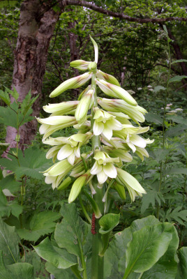 Декоративная лилия. Интересна своими крупными ароматными зеленовато-белыми цветками и блестящими сердцевидными листьями. Кроме того, растение имеет лекарственные и пищевые свойства. Айны считали это растение хорошим средством от ожогов. А отвар из стеблей, высушенных в тени, употребляли как жаропонижающее. Луковицы выкапывали, толкли и делали из них лепешки, которые употребляли в пищу.