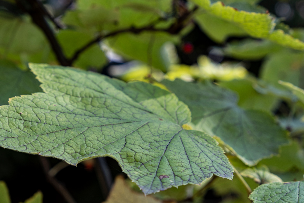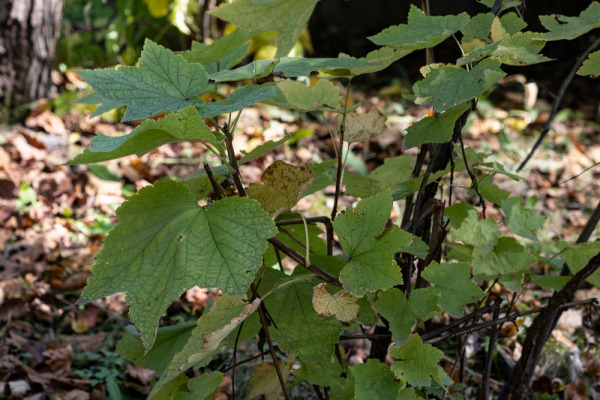 Листопадный кустарник высотой до 2 м. Побеги прямые, неколючие, коричневые, с шелушащейся коричневой корой, молодые побеги опушённые и железистые. Листья широкие, 3–5-лопастные с острозубчатым краем, шириной до 12-15 (18) см, что немного больше их длины, могут быть голыми, но чаще имеют густое бархатистое опушение с нижней стороны. Основание листа сердцевидное.