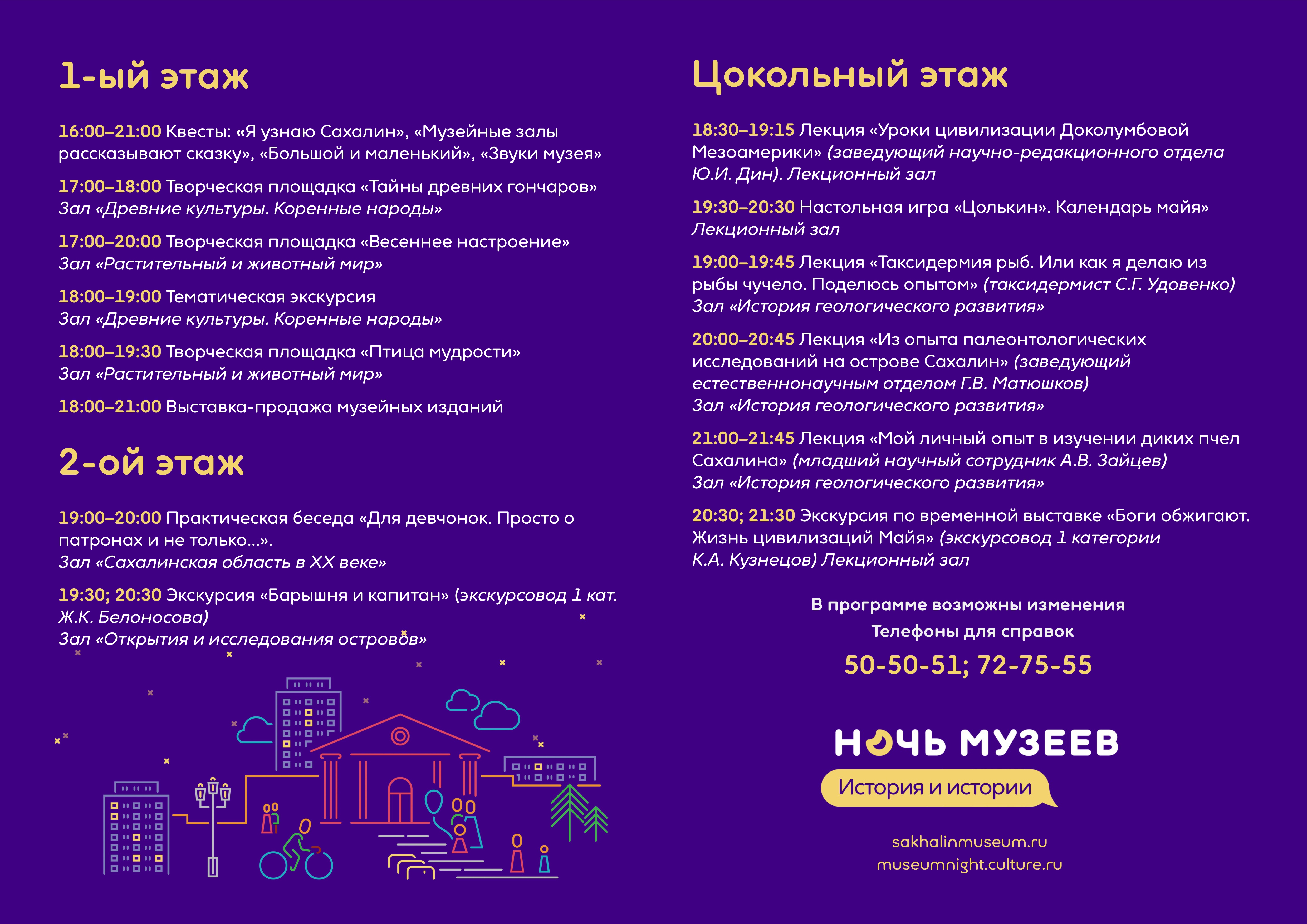 Ежегодная акция «Ночь музеев» пройдет в Южно-Сахалинске 20 мая. Сахалинский областной краеведческий музей подготовил для своих гостей насыщенную программу, с которой не заскучают ни дети, ни взрослые. Вас ждут тематические экскурсии, лекции научных сотрудников, мастер-классы, игры и квесты, театральная и музыкальная программы – в общем, мероприятия на любой возраст и вкус.