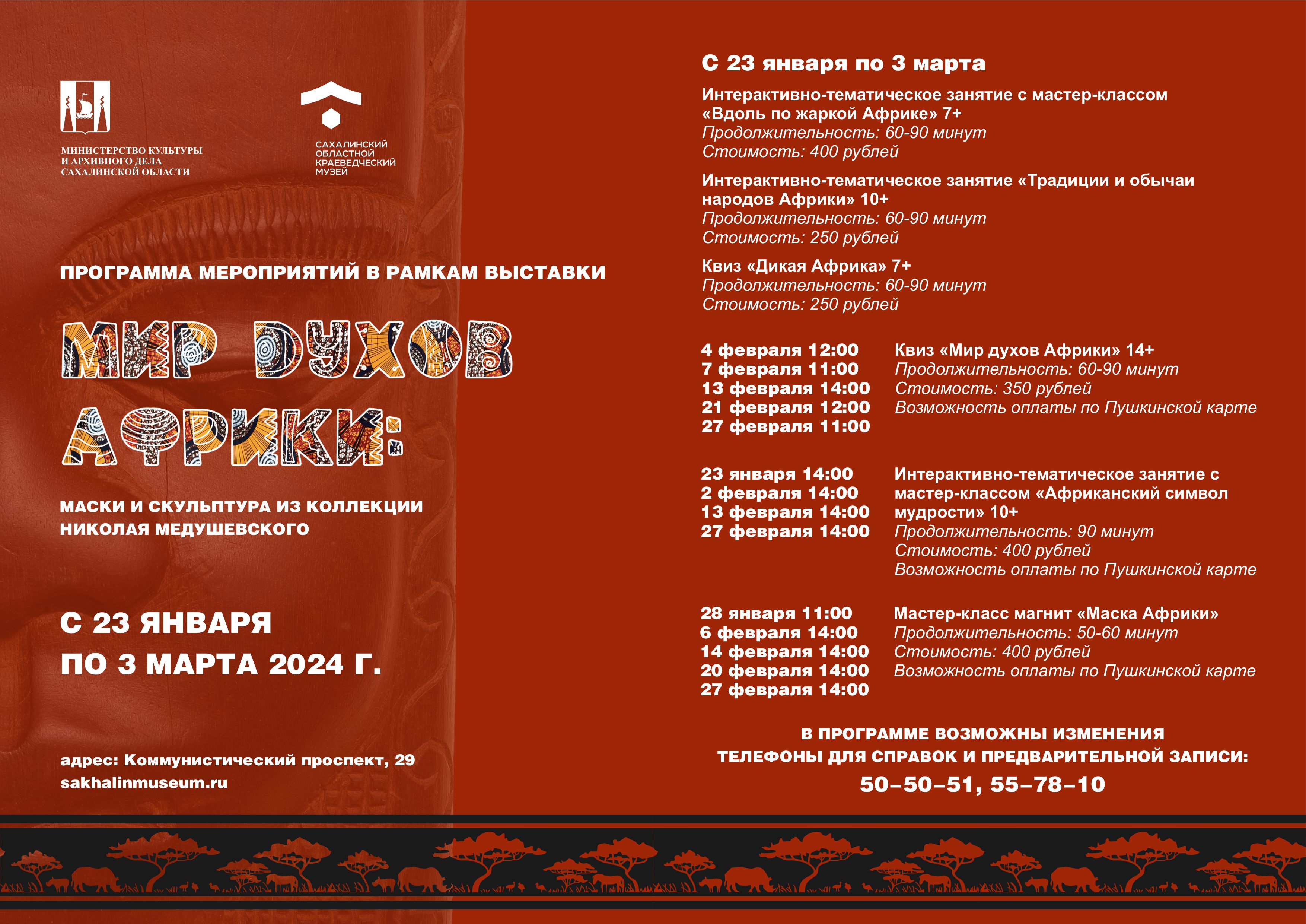 Продолжает работу выставка «Мир духов Африки: маски и скульптуры и коллекции Николая Медушевского». Мы подготовили для Вас увлекательные тематические мероприятия, которые будут интересны как детям, так и взрослым. Не пропустите!